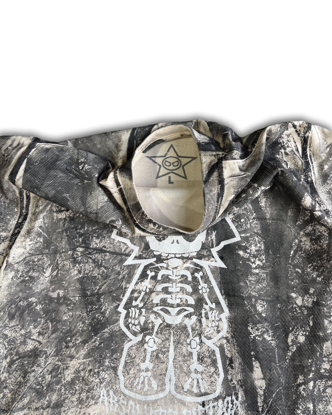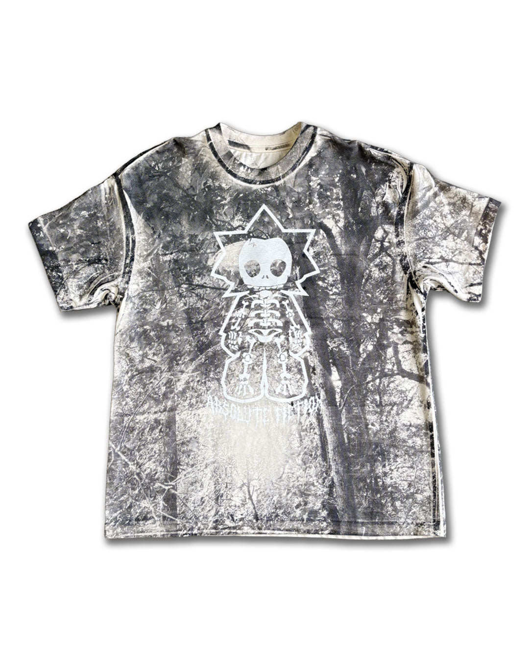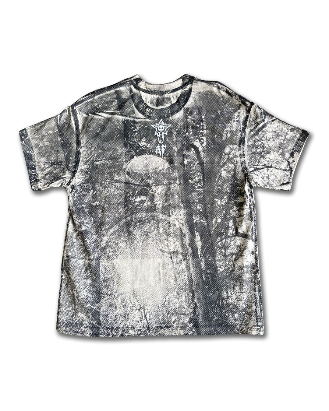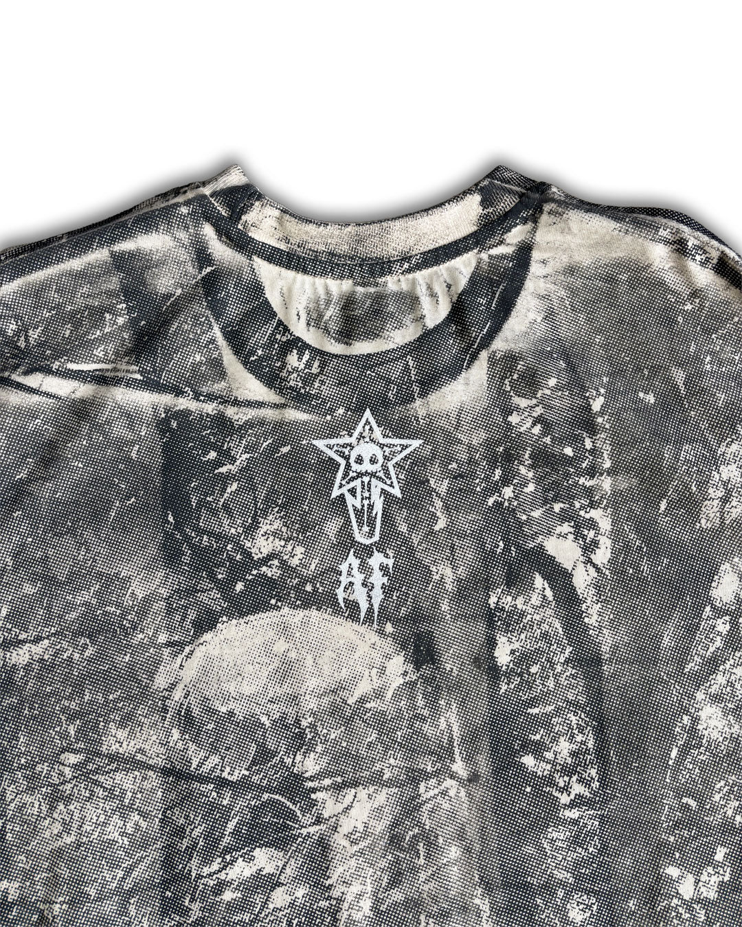 Cream colored shirt with dark grey all over screen print, white screen print on top